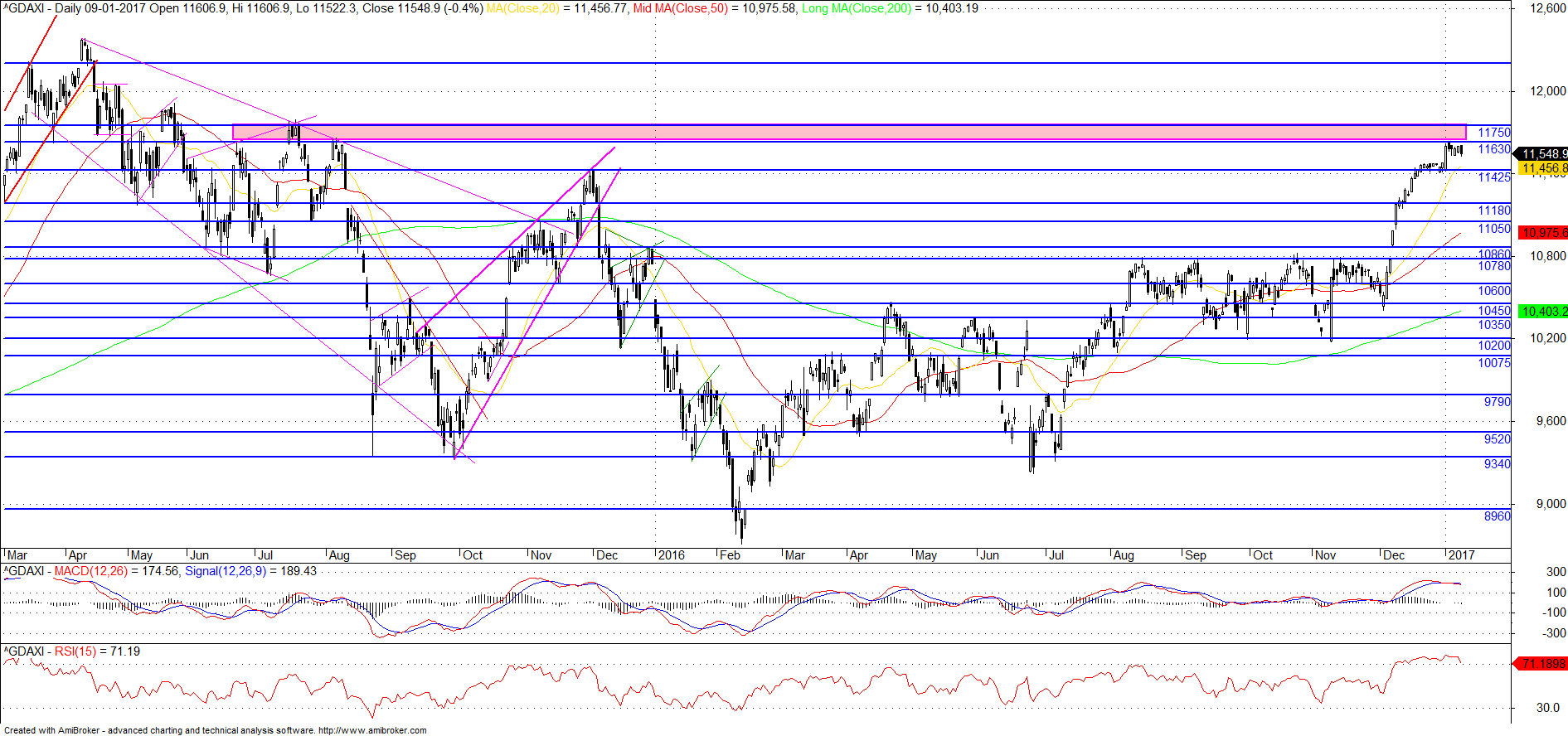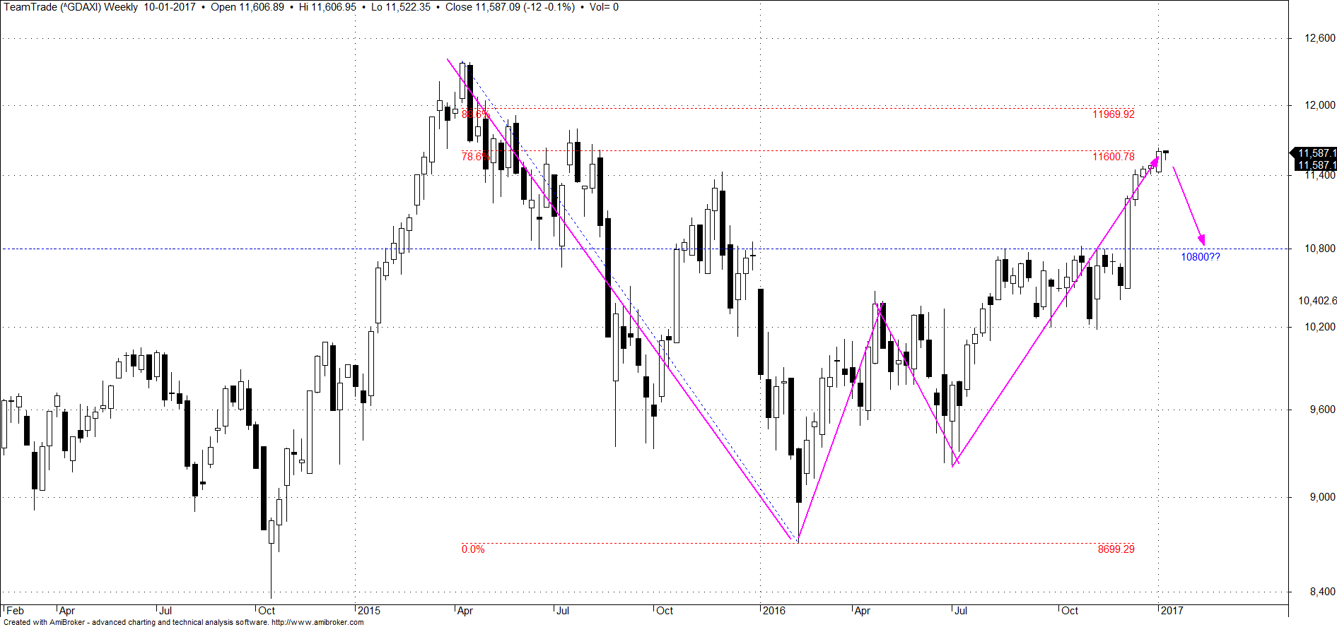 Olhando para o grafico semanal o unico periodo recente em que DAX teve RSI acima do valor atual foi em Março-ABril de 2015, mas depois o mercado após este periodo extenso de forte subida e indicadores tecnicos esticados ao limite , caiu forte entre abril e outubro de 2015.