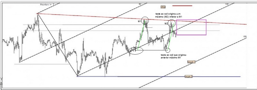 em relação ao gráfico anterior que postaste, presumo que tenhas tb tido em conta o teste ao coil que deu origem a um novo máximo (M2) inferior ao anterior máximo (M1) (conforme imagem em anexo), facto esse que te dá, para além do restante panorama de tendência descendente já por ti descrito, mais uma sugestão da perda de força do preço, correcto?