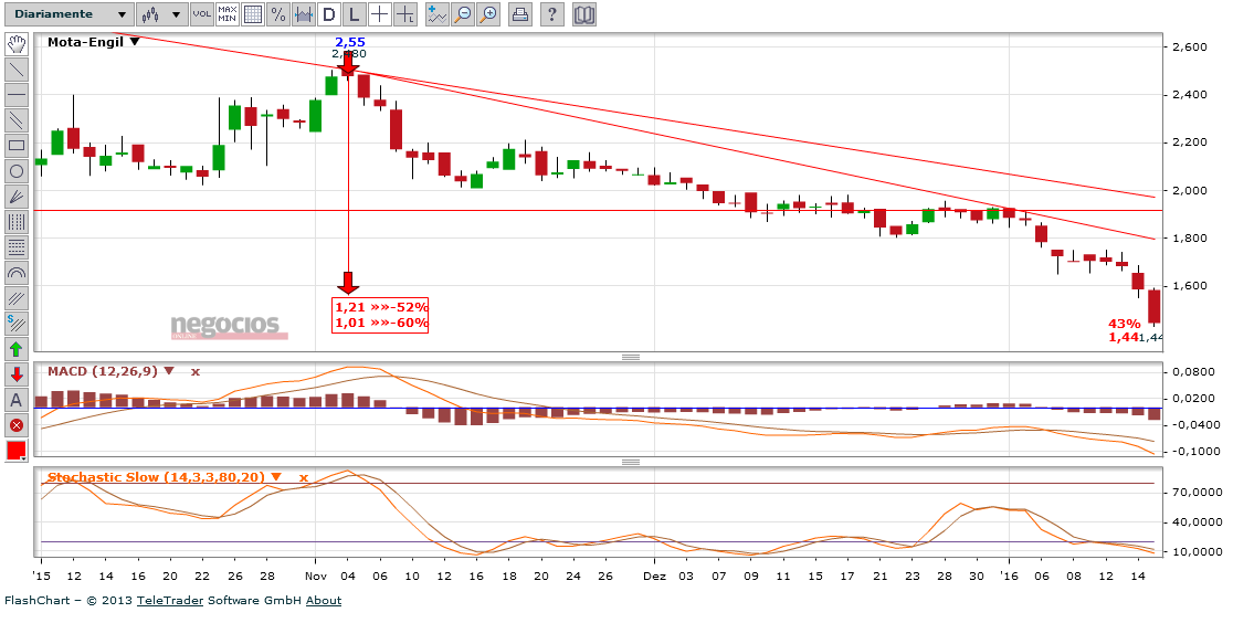 A zona dos 3,55 €, tornaram-se num suporte, tendo a Mota Engil, testado este valor diversas vezes durante o 3º Trimestre de 2008. No final do ano de 2008 e no início do ano de 2009, a Mota Engil, gerou uma nova zona de suporte nos 2,10 €, tendo partido deste valor um Bull Rally de cerca de 7 meses, levando a cotação da Mota Engil até aos 4,55€. Atingido este valor, identifica-se uma Linha de Tendência Descendente, entre o período de Outubro de 2009 e Janeiro de 2011, altura em que a Mota engil atingiu o valor de 1,63 €. Importa referir o suporte criado durante este queda, na zona dos 2,10 €, onde a Mota Engil evoluiu entre Maio e Outubro de 2010, este suporte serviu de Resistência à Mota Engil, na altura em que se verifica a quebra em alta da Linha de Tendência Descendente identificada anteriormente.