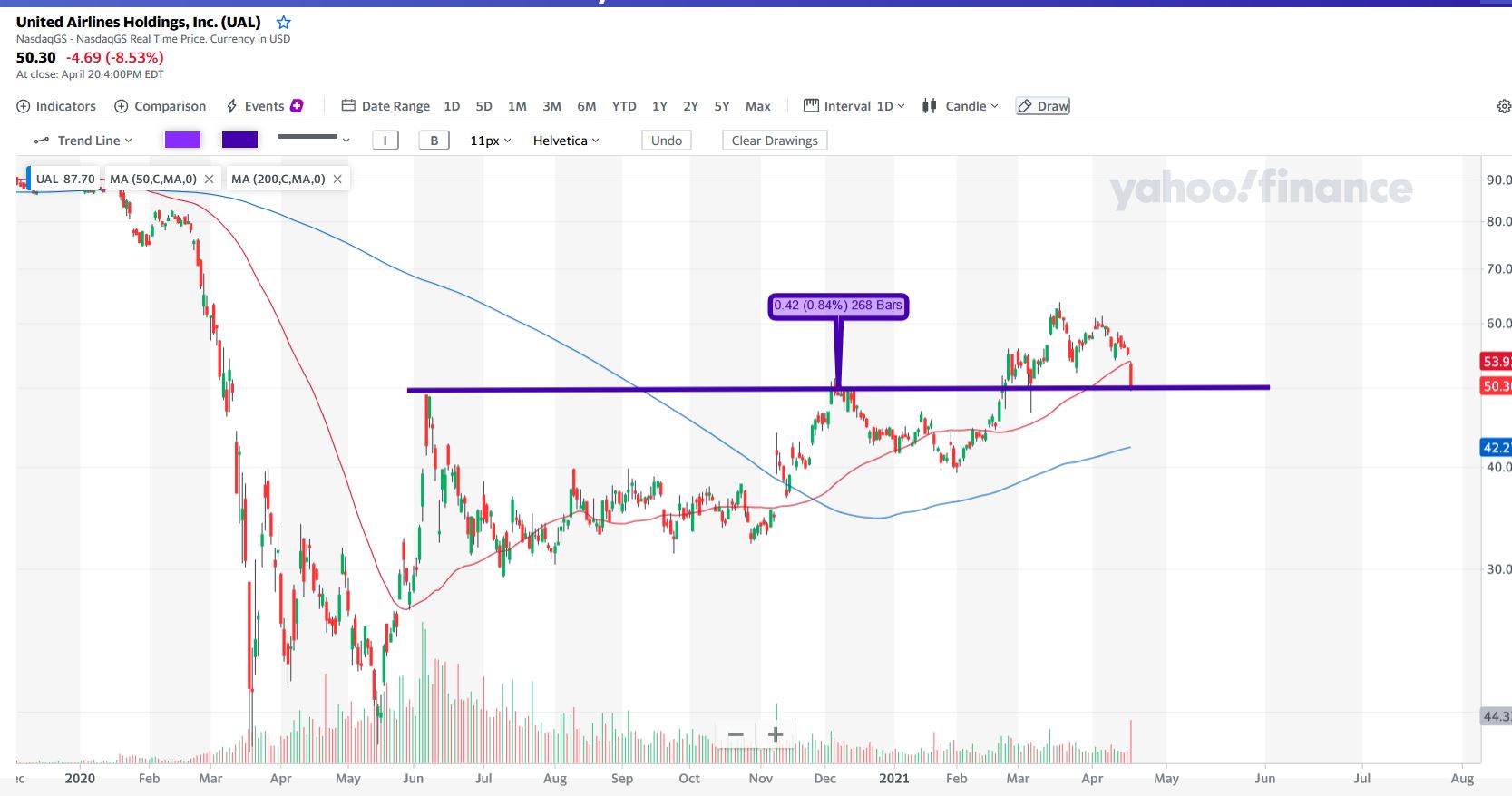 De qualquer forma fica aqui um "quick flip" em zona de compra, a UAL. O target inicial nos 60$ se o vento estiver de feição...