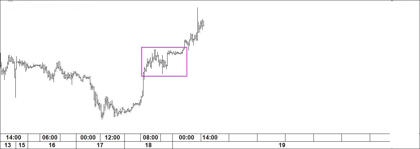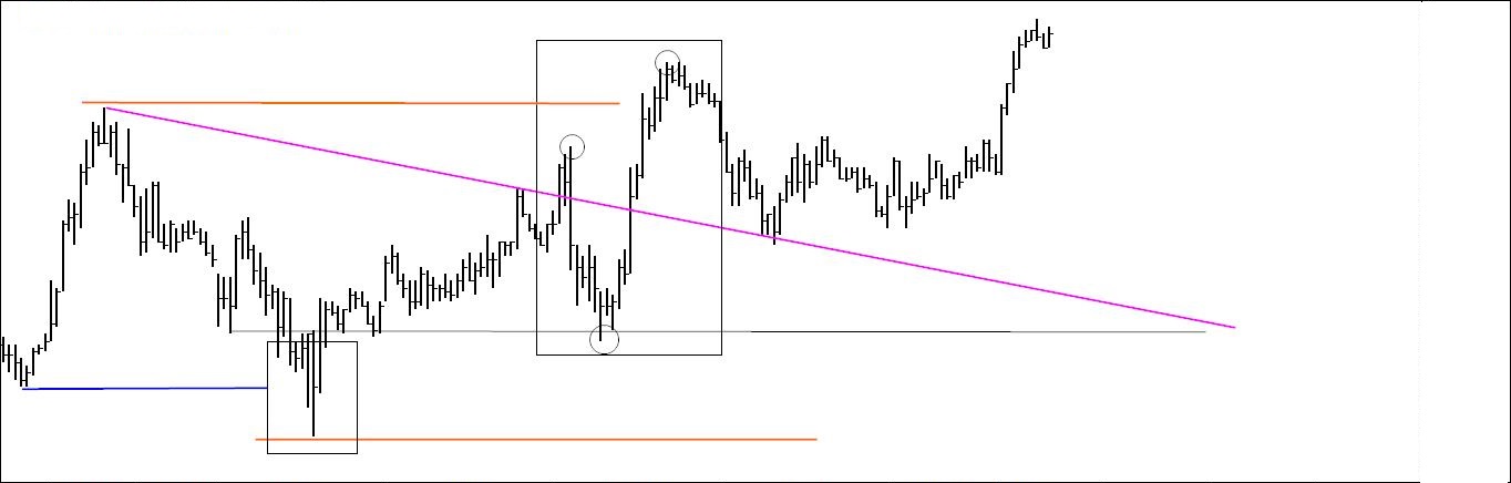 O gráfico 2 destina-se a fazer o acompanhamento do padrão "V na linha". Também se aproxima a hora da verdade. Pode aguardar-se que o preço se digne fazer o movimento desenhado. Neste padrão a técnica nada tem de complicado: vende-se o topo e compra-se a base. O inverso deve ser feito quando se estiver perante o "V invertido na linha".