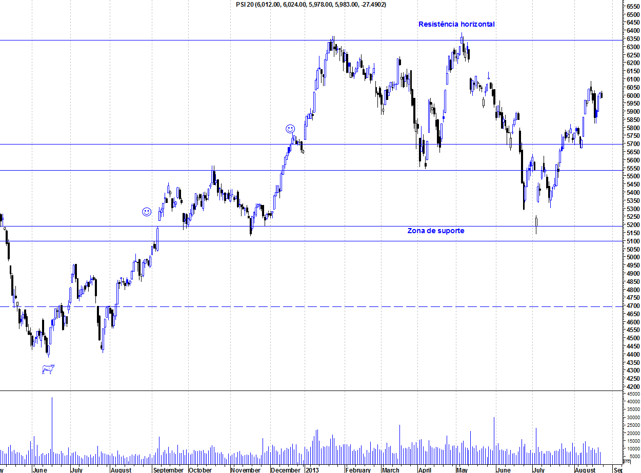 Assim volto a apanhar o PSI-20 ainda acima dos 6000, com alguns dias de fortes subidas, sustentadas pelas notícias positivas que têm surgido da Europa, e do ritmo da nossa economia. No entanto penso que estamos próximos de uma retracção, para procuprar novos suportes e ganhar novo fôlego para conseguir quebrar os máximos atingidos.