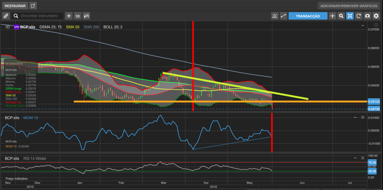 Finalmente antes da estocada final no BCP, definição de estocada final, cotação muito próxima dos € 0,02, acredito numa ligeira recuperação do título ali até aos € 0,03; € 0,031