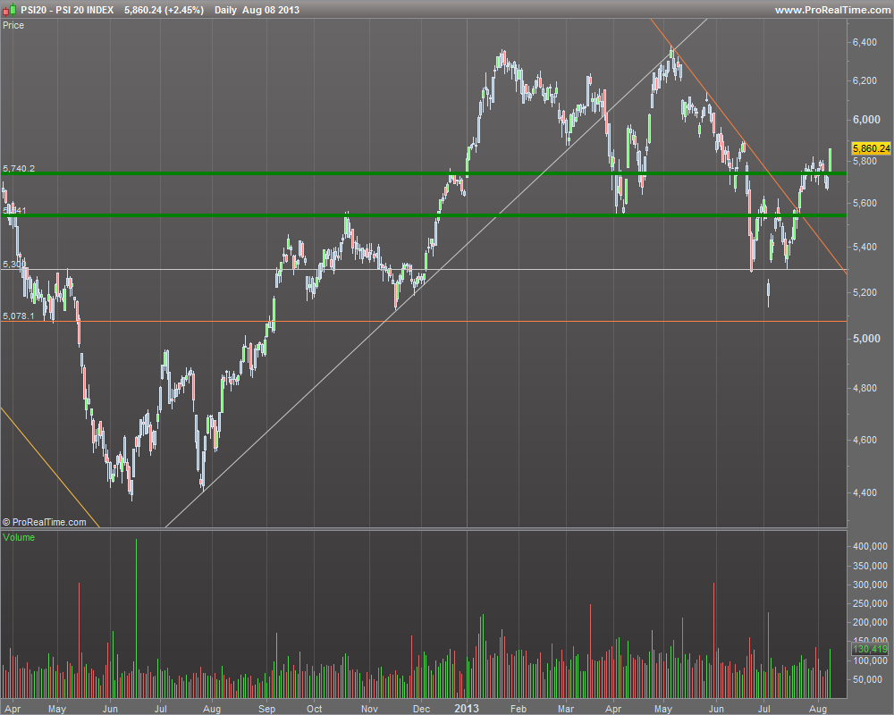 Mais gráfico que análise, ainda assim: aparenta estar a 'fugir' da zona de resistência de que tanto se tem falado (~5700) depois de ter quebrado a LTD de CP. O volume não é grande coisa mas enfim, é Agosto e ainda assim não dou tanta importância ao volume num índice como numa acção. Os mais cautelosos dirão para esperar a confirmação de quebra antes de uma eventual entrada, os mais arrojados considerarão já que a resistência virou suporte, que pode ser um bom stop loss (a quebra em baixa).