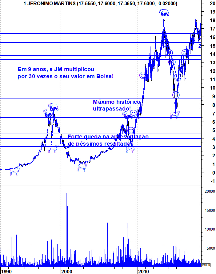 Fui recuperar este tópico bem longe numa das páginas secundárias do Caldeirão. A Jerónimo Martins está bem próximo do máximo histórico e continua a passar despercebida. Olhar para este gráfico é perceber o que é um "Bull Market". Muitos nunca o viveram, por isso é difícil posicionarem-se nesta realidade.