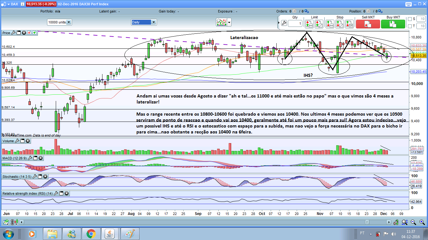 Curiosamente, no semanal vejo um cenário mais bearish enquanto no diario...pode haver ai a formaçao de um IHS que temos de ver se activado, pois o que eu vejo no diario é muito pouca força e vontade de subir.