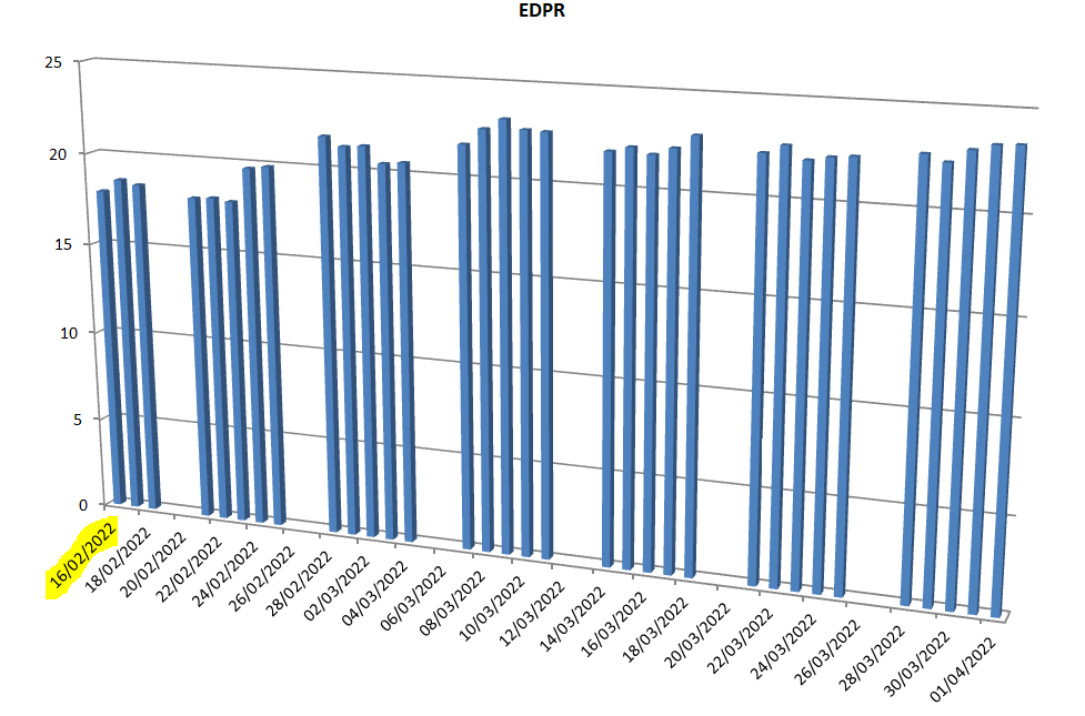 Os Resultados de 2022 foram conhecidos, em 16/02/2022. A EDPR só reagiu em Bolsa uma semana depois (24/02/2022).
