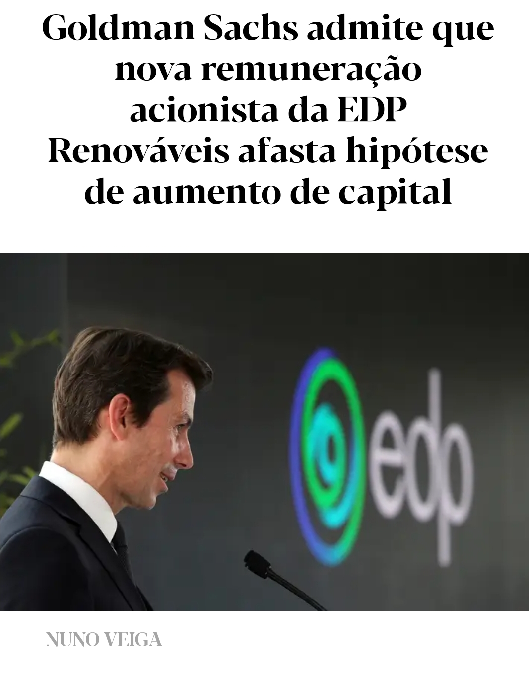 Depois de conhecida a iniciativa da gestão da EDPR de trocar o dividendo do corrente ano por novas ações, quer o Goldman Sachs, quer o muito bem informado jornalista do Expresso, Miguel Prado, vieram a público sossegar os acionistas da EDPR de que, para já, estará afastada a necessidade de um novo Aumento de Capital que muitos temiam.