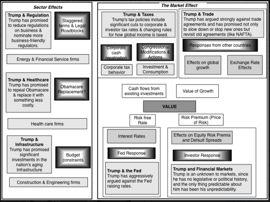 The value of stocks collectively can be written as a function of three key inputs: the cash flows from existing investment, the expected growth in earnings and cash flows and the required return on stocks (composed of a risk free rate and a price for risk). The following figure looks at the possible ways in which the Trump presidency can affect value: