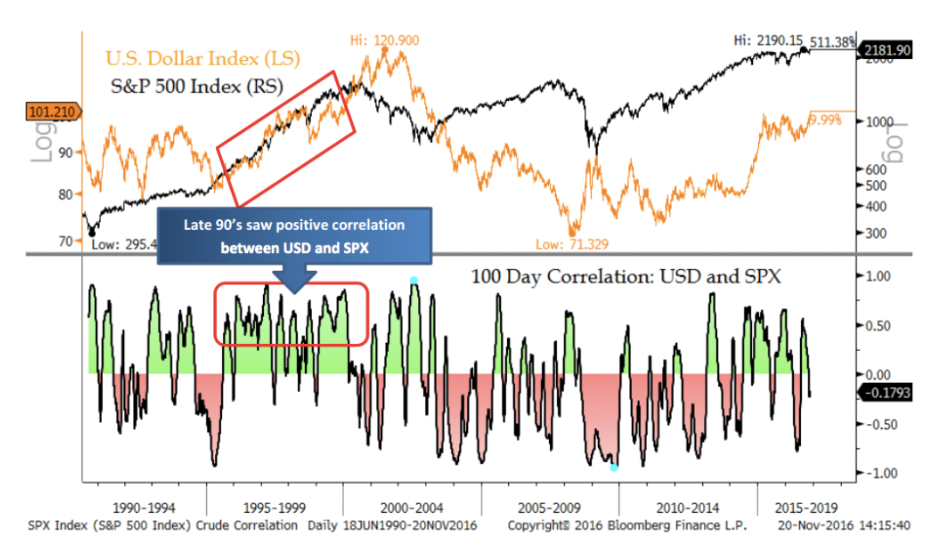 There is zero evidence of a long-term correlation between stocks and the dólar.