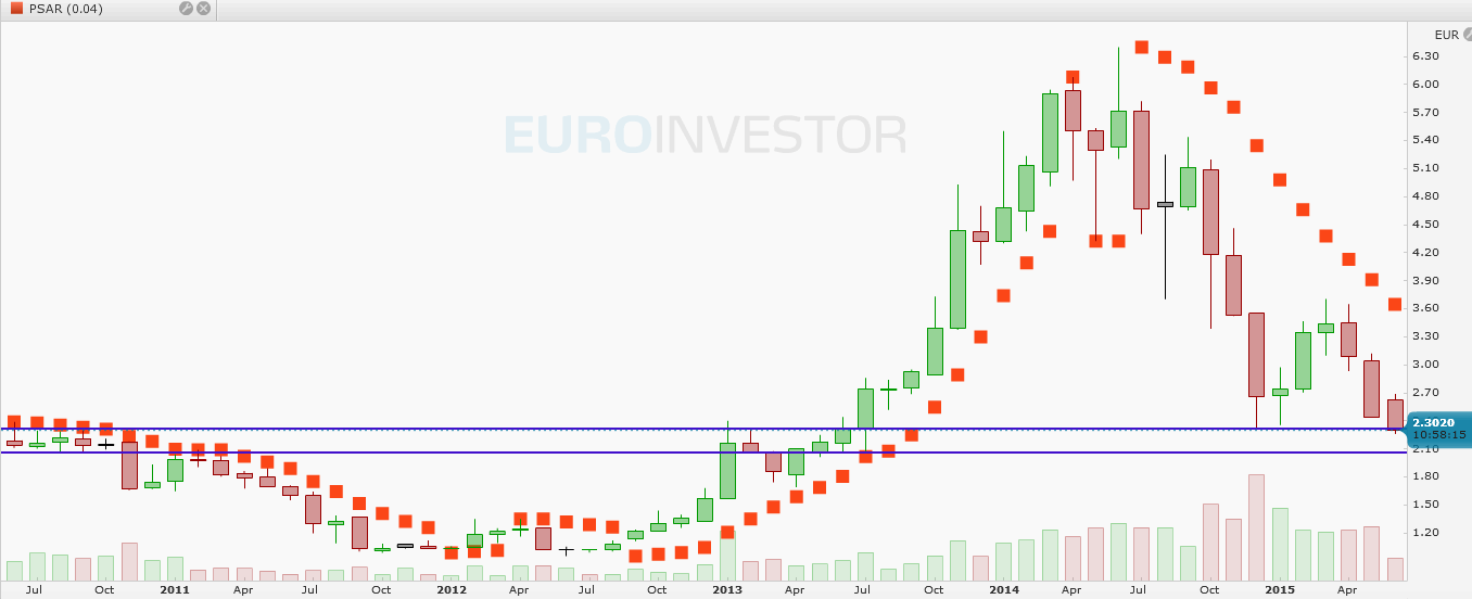 Ora então mais um gráfico, EGL mensal + parabolic SAR (quem diz que só serve para curto prazo)