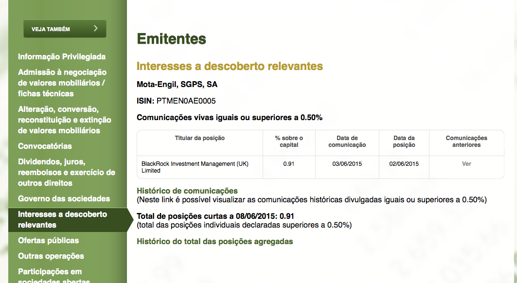 Entretanto, convém não esquecer um pequeno pormenor. Não sei se repararam, mas a posição short da Blackrock já vai em cerca de 1%. Ora 1% são cerca de 20 milhões de acções. Podemos vir a ter aqui um dos maiores short squeezes da bolsa portuguesa, se isto inverter de repente (Grécia, obras, seja lá o que for...). 20 milhões de acções num título ilíquido como este (normalmente tem cerca de 40 mil acções nas 10 melhores ordens, de cada lado), vai ser uma corrida para a porta ao nível de algumas coisas que vemos nos States...