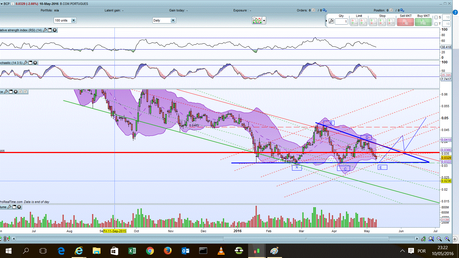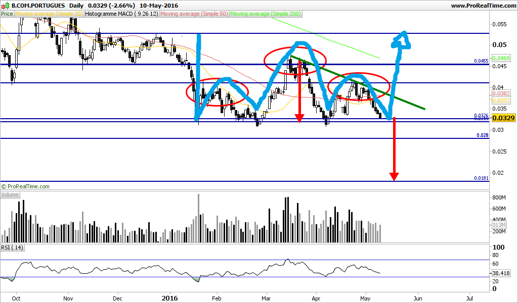 Em 10 de maio de 2015 o bcp cotava a 0,09, passado um ano o titulo passou a cotar a 1/3 do valor... em 12 meses a cotação caiu 63%, no entanto nos últimos 4/5 meses dos últimos 12 meses a cotação esteve praticamente inalterável, oscilou no intervalo de 0,03/0,04... Terminou a tendência de queda? acredito que sim...