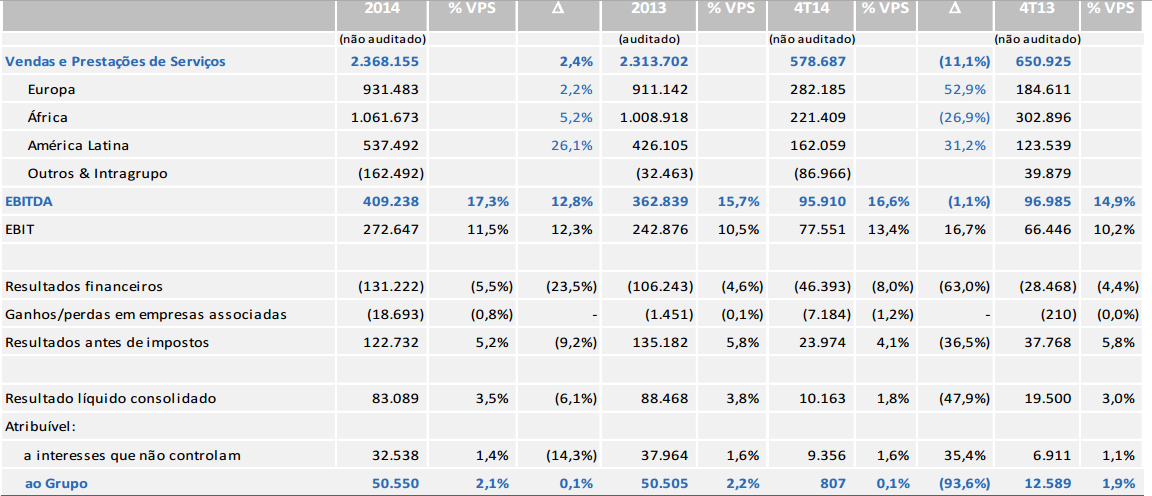 O Resultado líquido consolidado diminui de 88 para 83M € mas o enfoque que é dado é apenas nos resultados do grupo que se mantiveram nos 51M parecendo desprezar os resultados atribuíveis a interesses que não controlam onde há perda de 5M € passando de 38M € em 2013 para 33M em 2014.