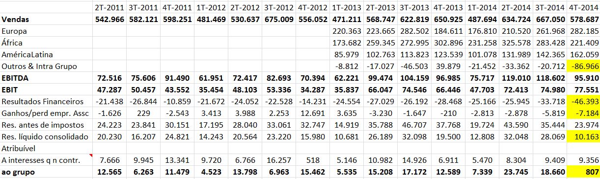 As vendas e resultados operacionais parecem-me fortes (ver EBIT). As operações na europa e américa latina compensaram a desaceleração em áfrica. "Outros & intragrupo" penalizaram imenso o EBITDA, mas não sei ao que se refere. Alguém sabe?