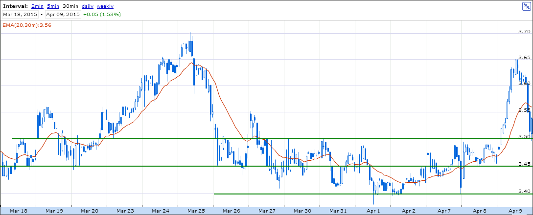 Pelo que vejo a ação não se tem conseguido aguentar acima dos 3.60 por muito tempo, o que seria uma boa zona para consolidar (3.60-3.70) e com isso preparar o terreno para subidas mais sustentadas! Hoje foi a 3.65 cheia de "momentum" e boas compras com volume e depois parece que os compradores desapareceram de um momento para o outro, ao estilo "bear trap"...e lá veio ela a pique para o ponto de partida. "Momentum Traders" todos eufóricos de manhã...e rabinho entre as pernas de tarde, que não há mais guito para alimentar o comboio a vapor...! Mas pronto, lá deram uma voltinha no carrocel