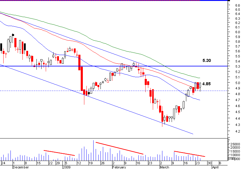 Para além do canal referido, identifico duas zonas de resistência: nos 4,85 correspondente ao penúltimo mínimo relativo (ultrapassada marginalmente na sessão de hoje) e nos 5,30 (esta bastante mais importante que a anterior).