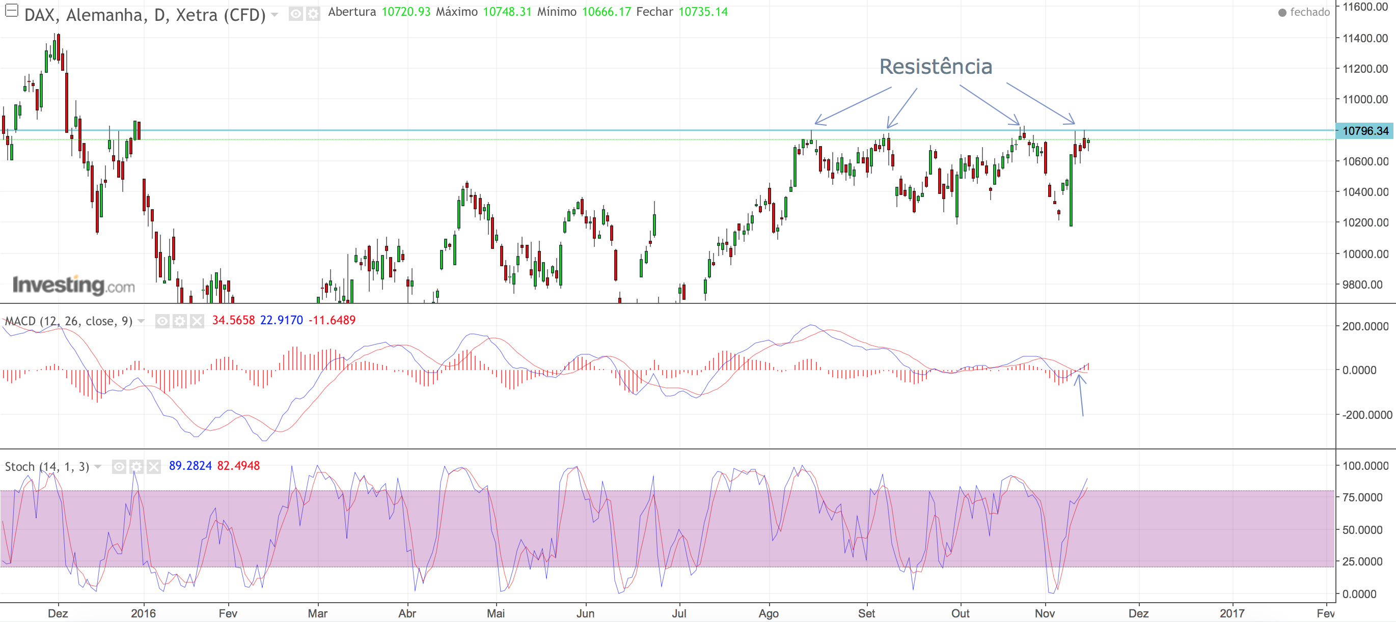 Tecnicamente é difícil dizer, o que se pode adiantar é que os 10800 já se revelaram uma resistência forte em várias ocasiões, como indicado no gráfico, e os preços andam mais uma vez a namorar essa zona. O MACD inverteu recentemente podendo indicar que o caminho é para cima e o stocastic ainda não deu sinais negativos. Podemos ter uma boa oportunidade para quebrar os 10800.