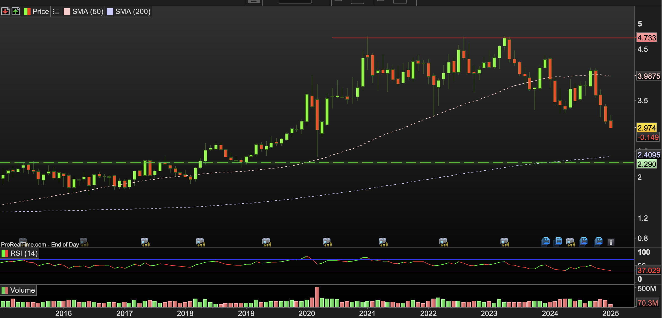 No Gráfico mensal o suporte é mesmo nos 2,30€.