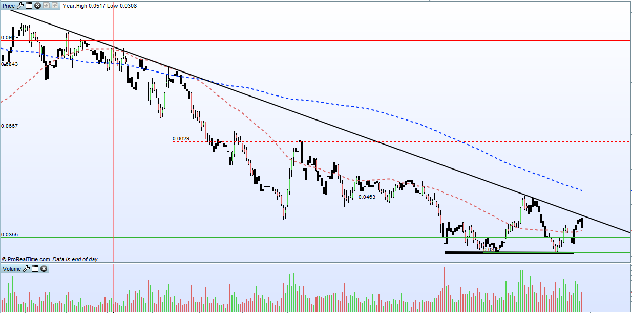 ativo surfar a tendencia nada mais tenho um lote perdedor mas tenho ganho mais valias ... com projeçoes de muito curto prazo agora acredito que tenha força para quebrar os 0.0420 vale uma aposta