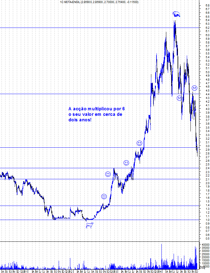 Para além da exposição a países, cujo PIB depende das cotações do petróleo e consequentemente o pagamento dos serviços e obras contratadas, tecnicamente até aos 3€ poderia ser considerada uma correção do movimento ascendente iniciado em abril de 2013, contudo, parece que essa correção está demasiado estendida , levando-me a acreditar numa projeção descendente... sendo a próxima paragem por volta dos 2,40 ou mesmo quiçá os 1,69...
