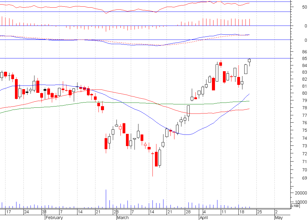 Ontem o título fez um novo máximo de 3 anos no intraday ao cotar a 85,60 embora tenha aliviado para o final da sessão, mas hoje está novamente acima dos 85.