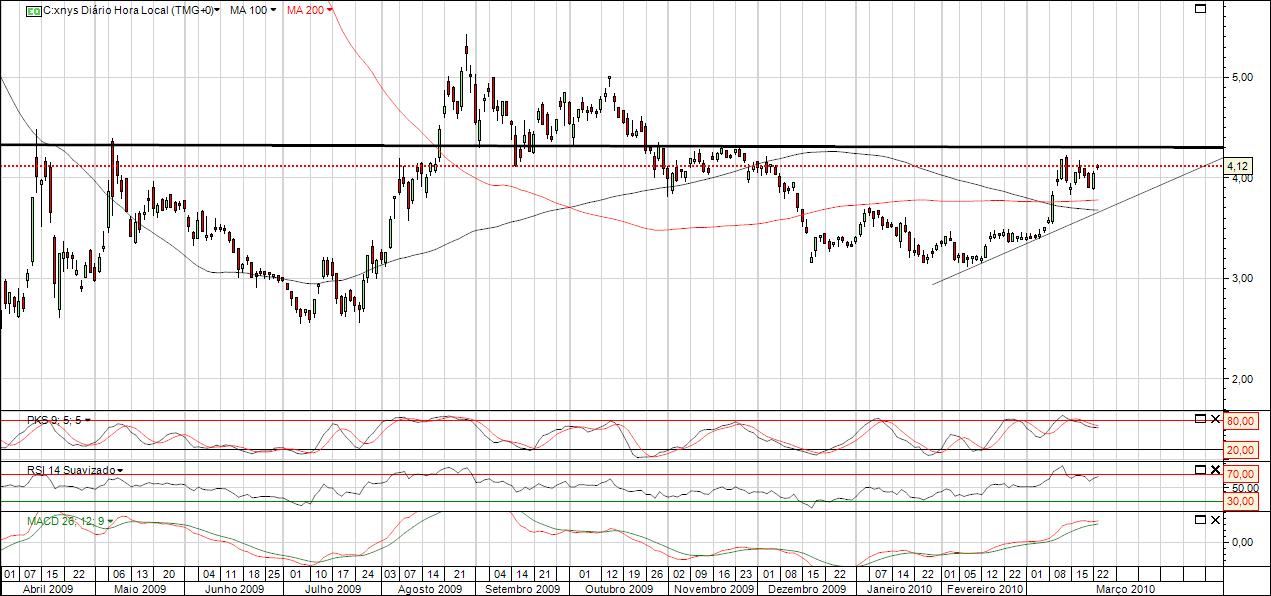 A próxima resistencia é os $4.41 mas não é uma grande resistencia.