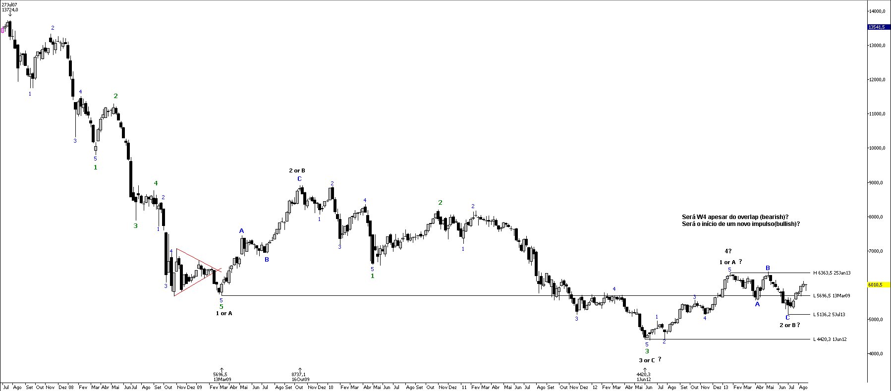 Não sei se o ilustre Ulisses ao apontar o valor de 5700, para separar o seu estado bearish de bullish, se baseou nas EW, mas poderá nos dizer, porque como disse anteriormente e volto a acentuar uma regra das EW diz que a W4 não pode sobrepor a W1.