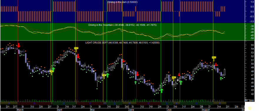 Tudo na mesma e uma pequena curiosidade na amostragem dos indicadores do sistema SO no gráfico semanal do Petróleo: 3 sinais consecutivos de venda/compra/venda em 3 semanas seguidas de julho de 2014 (ver 2. gráfico abaixo) e daí para cá sempre estável na posiçao de tendência descendente de longo prazo.