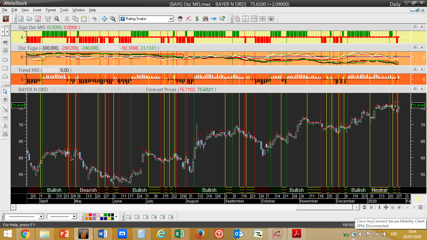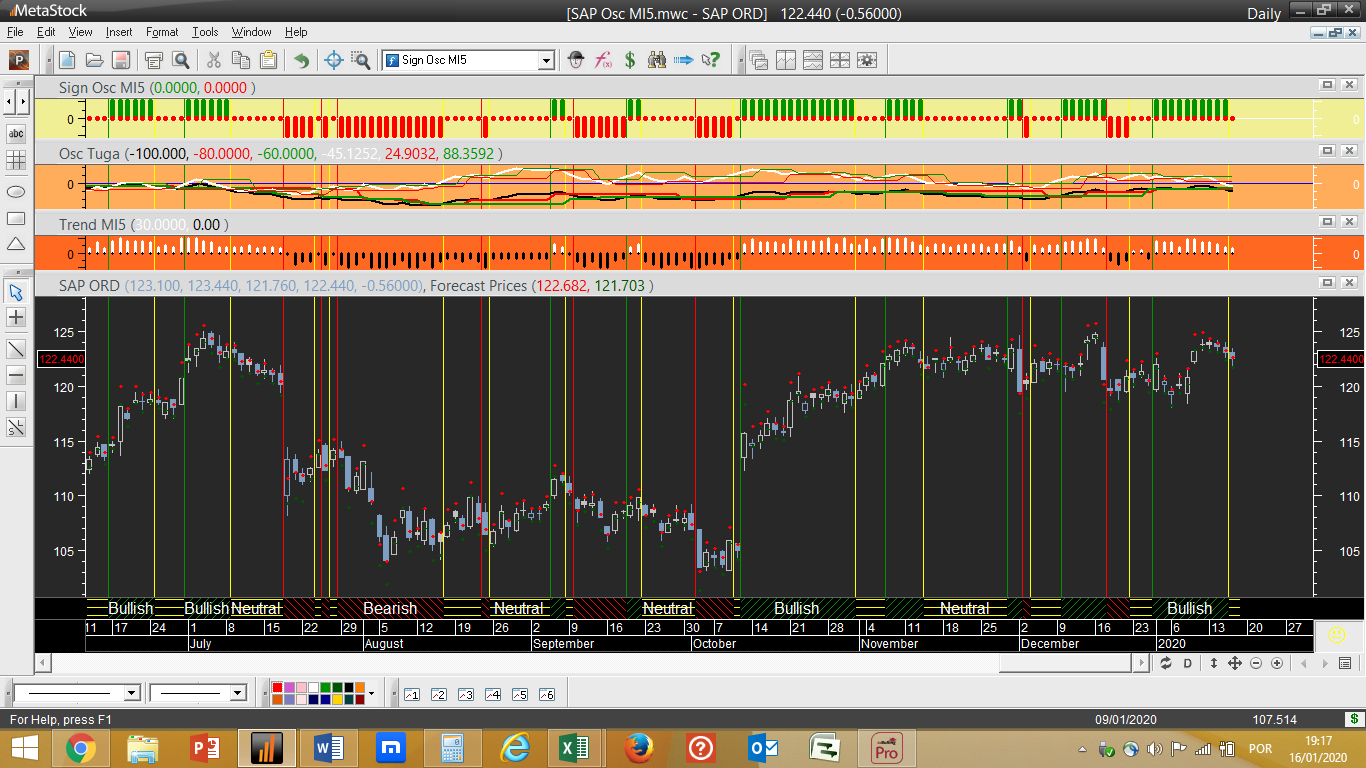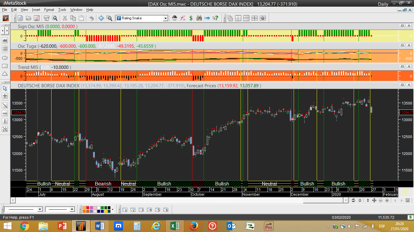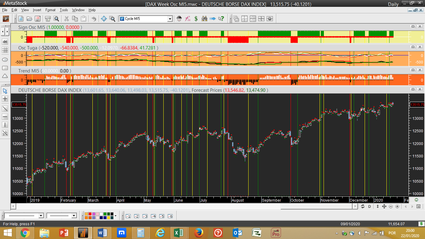 Para exemplificar melhor o que quero dizer atentem no 1º gráfico abaixo do DAX, que se foca num cálculo prévio dum indicador crítico que irá mais tarde integrar os valores finais do sistema “Osc MI5”, sendo o 2º gráfico o do sistema de trading do DAX no formato final habitual, que vai mantendo para já um sinal de compra.