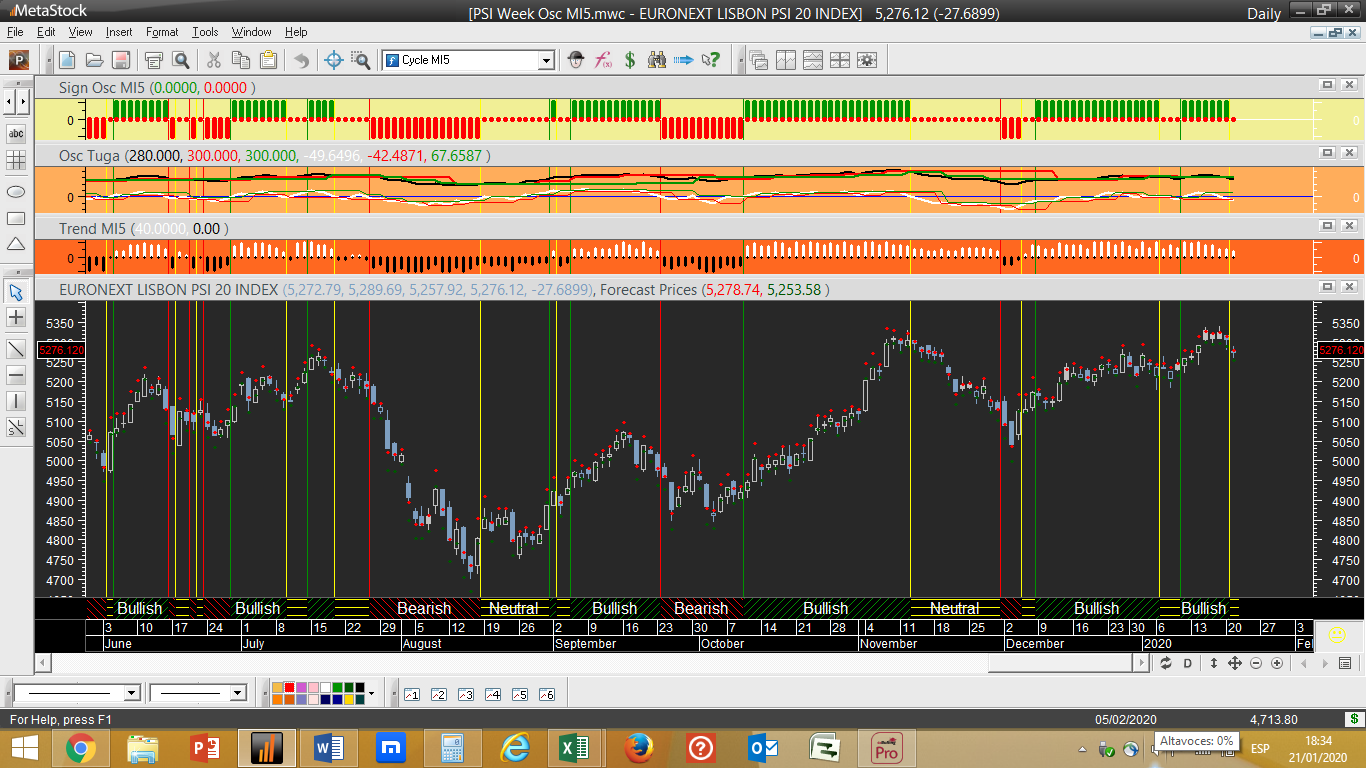 O gráfico do dia é o diário do PSI, o seu ciclo ascendente de trading diário terá ficado hoje interrompido mas a manutenção ascendente do ciclo e tendência no período semanal permitem manter o seu sinal de comprado à data atual.