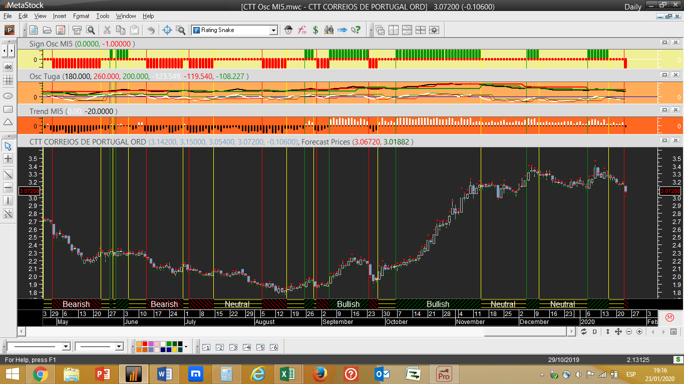 CTT – Passa de comprada a neutral, com nova tendência negativa diária e mantendo-se a semanal positiva. Ver gráfico abaixo.