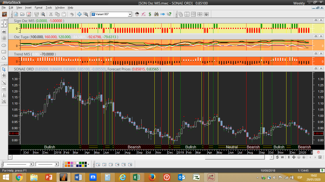 No 1º gráfico em causa aparece um dos indicadores básicos intermédios, na parte de cima do quadro, denominado “Tuga Rat”, que faz parte dos indicadores finais que aparecem no sistema de trading “Osc MI5” final. Desse indicador podemos obter o somatório das parcelas retiradas da parte de cima do gráfico correspondentes à última vela: