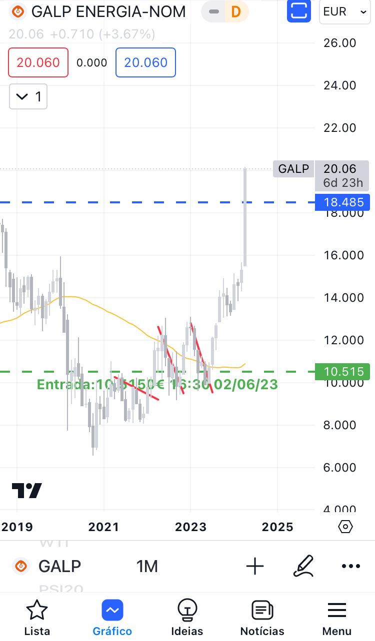 Agora coloco o da Galp e mais tarde coloco os outros. Houve uma subida expressiva da Galp desde junho de 2023 e está neste momento no máximo de sempre. A linha tracejada a azul representa uma possível linha de suporte. É um máximo antigo em fecho. É apenas uma linha para ter como referência.