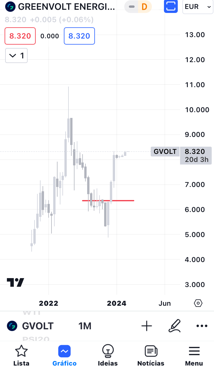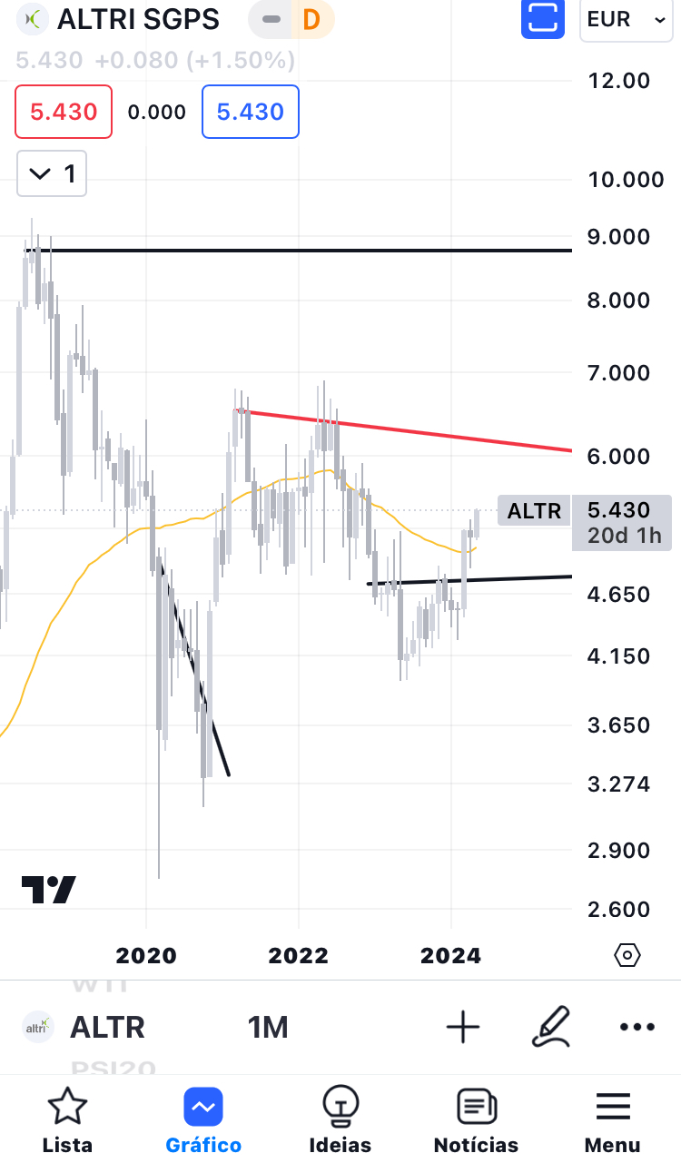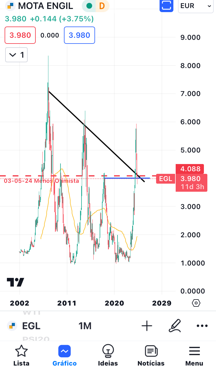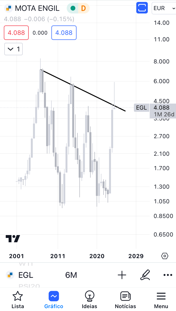 A MotA Engil está a subir hoje. Este é o gráfico mensal. Não dá para ver de forma perfeita, mas vê-se razoavelmente. As linhas preta e azul eram antigas resistências e agora são possíveis suportes. Parece estar a querer aguentar-se nas linhas de suporte para depois voltar a subir. Tinha dito que estava menos otimista e está ligeiramente abaixo, mas vou alterar para neutro. Estou mais otimista, mas digo neutro. No próximo mês, se ela se aguentar, provavelmente direi otimista.