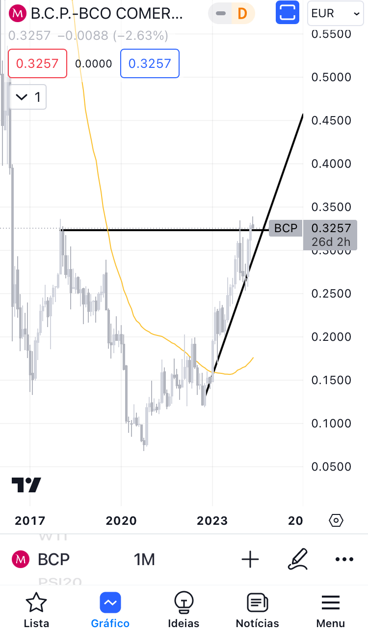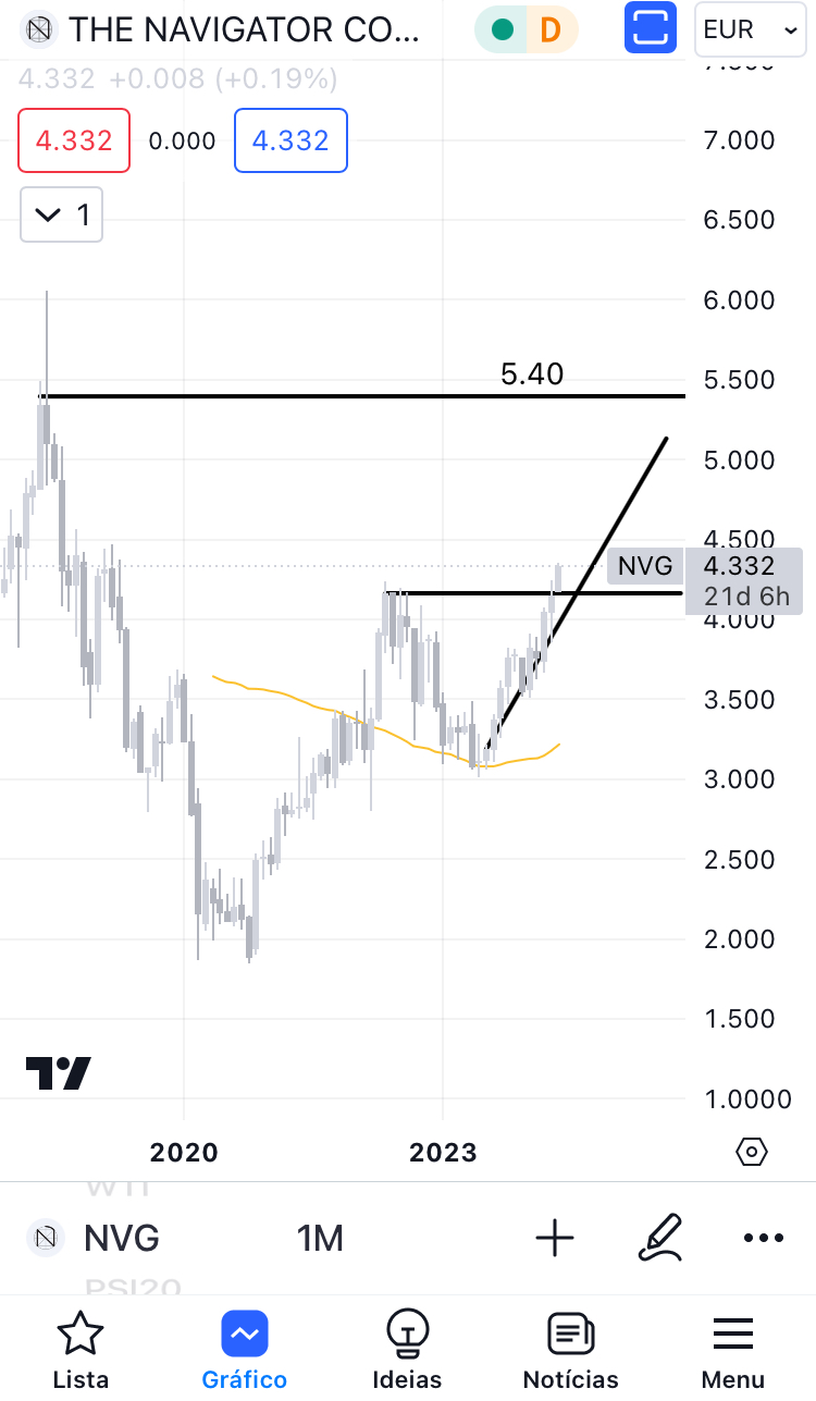 Este mês ultrapassou a linha de resistência horizontal dos 4,16, está acima da linha de suporte ascendente e com máximos e mínimos sucessivamente superiores. Tem o máximo de sempre em fecho próximo de 5,40.