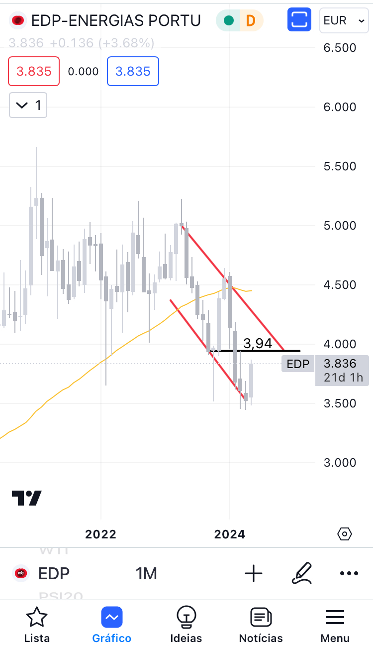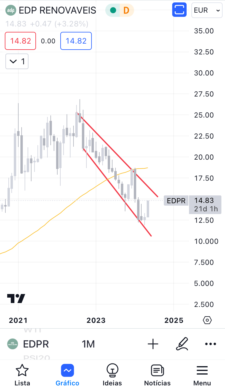 Ambas a EDP e a EDP Renováveis começaram a recuperar este mês. A EDP parece ter formado um canal descendente, enquanto a EDP Renováveis formou uma cunha descendente alargada, que é uma figura de inversão de tendência. Embora ainda não tenham ultrapassado a resistência descendente a vermelho, acho que há uma boa possibilidade de ambas subirem, com a EDP a atingir os 5 e a EDP Renováveis a atingir os 25.