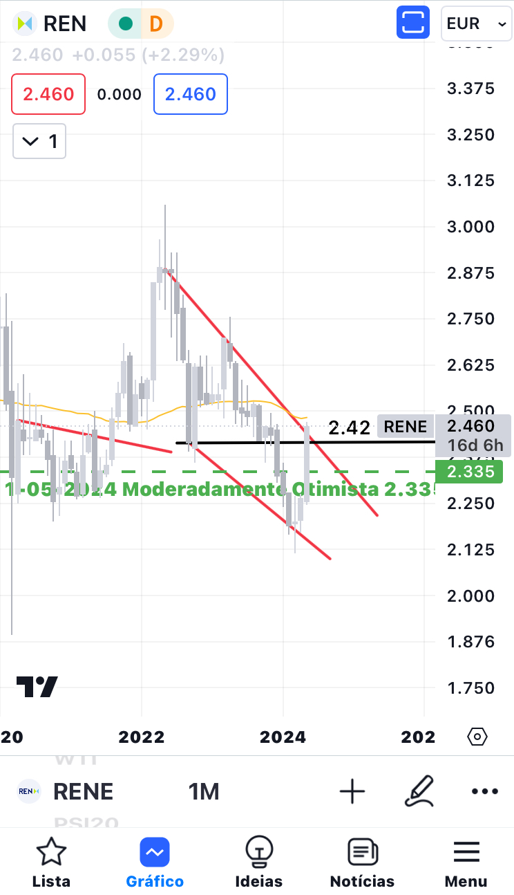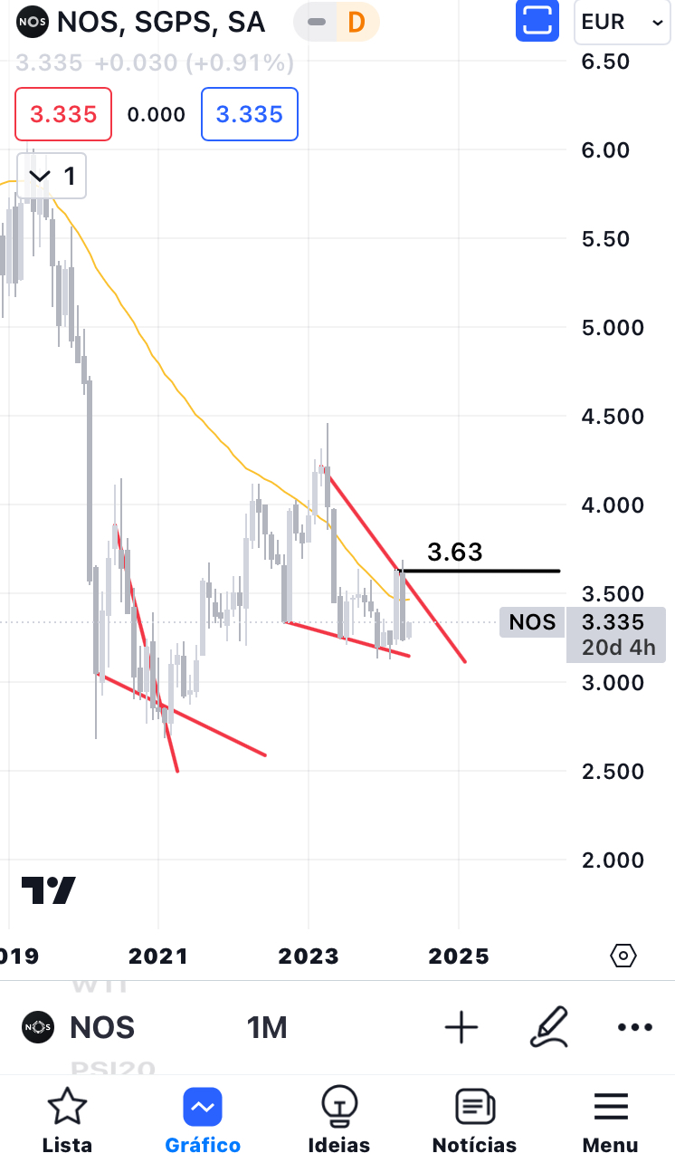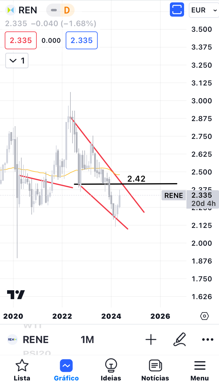 Não disse o objetivo teórico da formação, mas geralmente é o início da formação. Neste caso, é de cerca de 2,875 para a RENE e cerca de 4,20 para a NOS. Ambas já estão a ser cotadas a um valor superior ao momento em que fiz a análise. No caso da RENE, está agora acima da linha de resistência descendente a vermelho