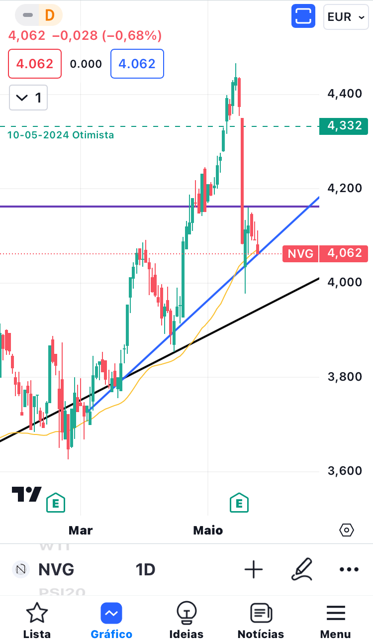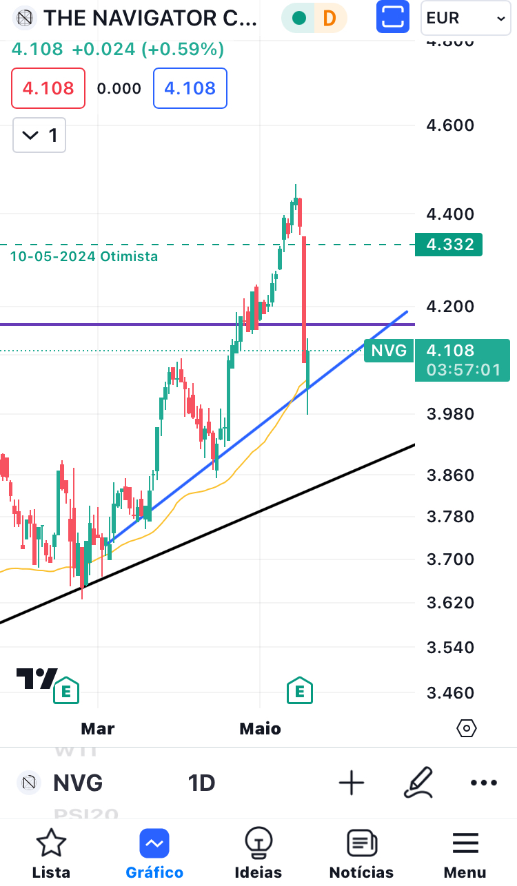Há 10 dias disse que estou otimista na The Navigator Company, mas na sexta feira teve uma boa queda. Hoje parece estar a reagir a uma linha de suporte. Talvez se aguente. É a linha azul no gráfico. As outras linhas são do gráfico mensal e não importam neste caso. Este é o gráfico diário.