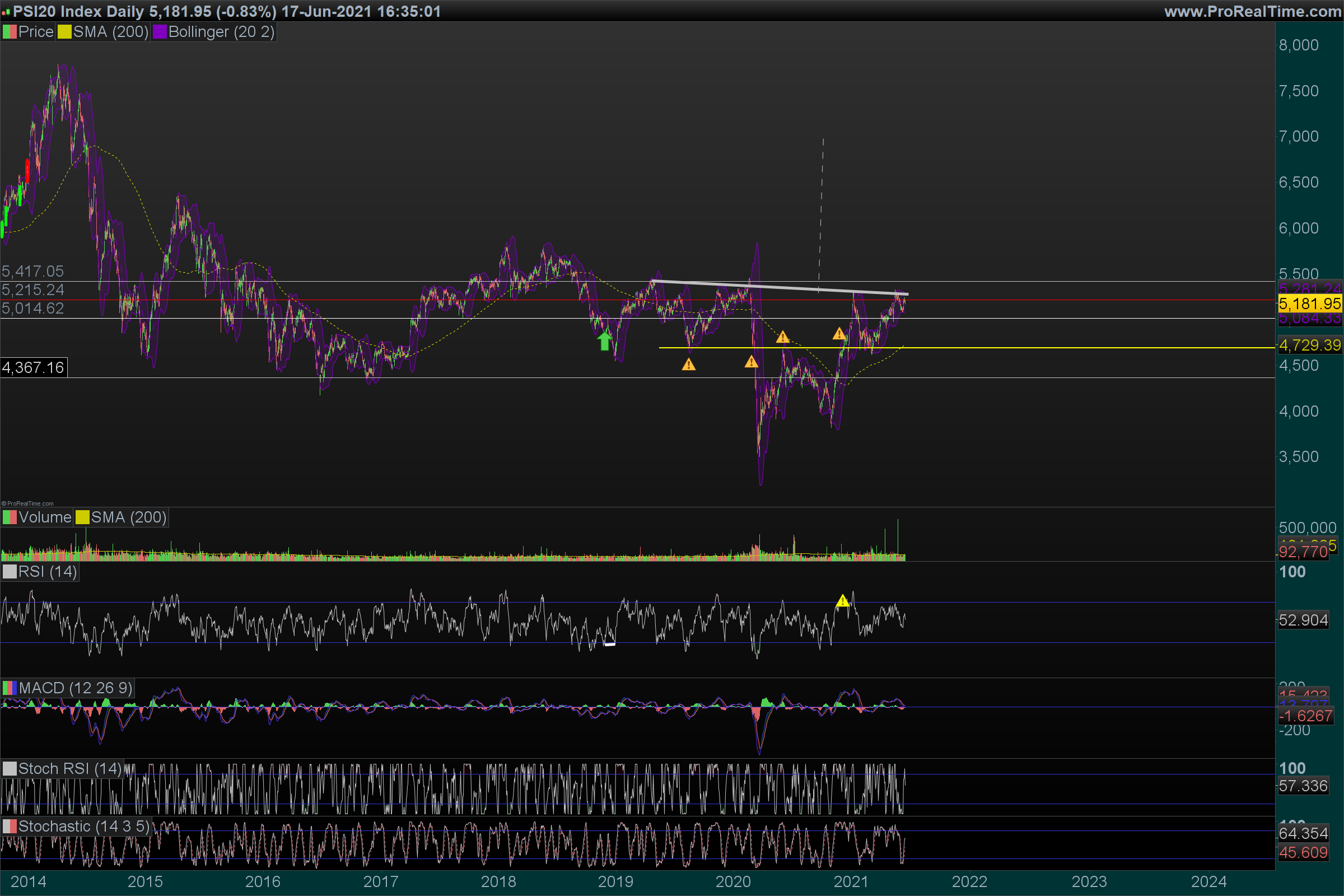 Triple Bull (CP, MP, LP), e os 5300 (RF1) parecem a piece of cake e todo o esforço da long term bullish trend aponta agora para os 5642 (RF3), ou máximos, em fecho, de 5 anos (correção intermédia no ataque ao RF2, sell in May). O sincretismo gráfico parece demonstrar que a solidez e potencial dos ativos lusos estão visíveis para Institucionais asiáticos e Europeus.