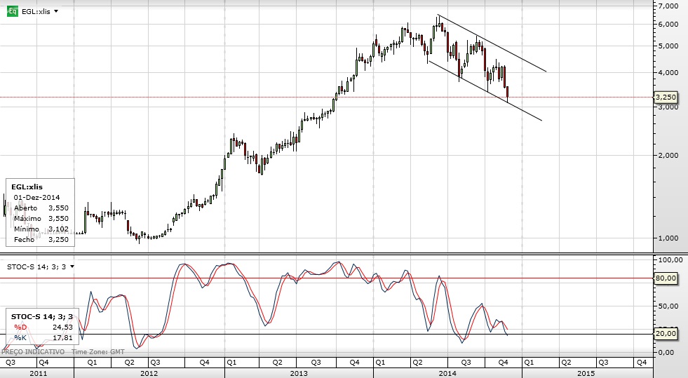 Eu não sou nenhum artista do pensamento especulativo, nem tenho grande experiência, negociar canais é o que tento fazer, e a EGL está muito bem canalizada. A médio/longo prazo, é fácil ver para onde caminha. Entradas longas serão apenas para aproveitar ressaltos enquanto a linha superior do canal não for quebrada em alta.
