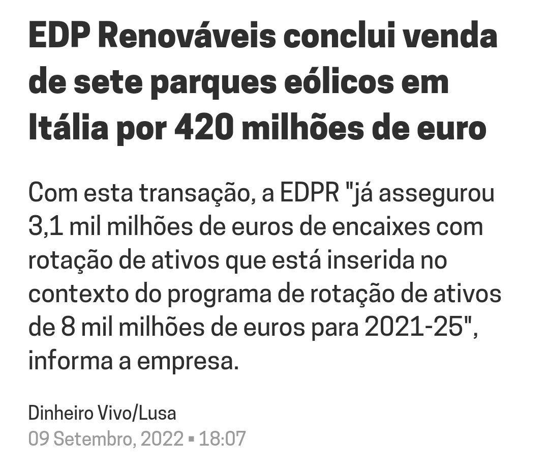 A EDPR acaba de vender 7 (sete) parques eólicos em Itália, com a potência instalada de 172 MWp por 420 ME de euros (com 3 anos de idade, em média). Isto é, por um preço de 2,44 ME por MWp.