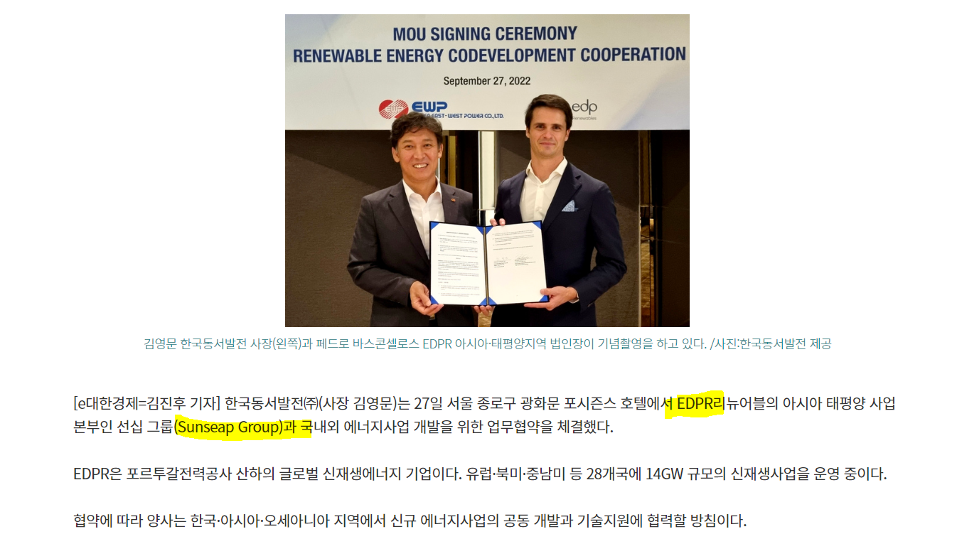 A Korea East-West Power Co., Ltd. assinou um Acordo Comercial com o Sunseap Group (EDPR), em Seul, no dia 27/09/2022, para desenvolver projetos de energia renovável na Coreia do Sul e países vizinhos.
