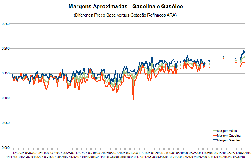 Recordo que isto são "margens brutas", não estão contabilizados custos de transporte, armazenagem, pessoal, etc. A "margem" apresentada é a diferença de preço entre o preço internacional do combustível refinado e o preço antes de impostos nos postos de abastecimento.