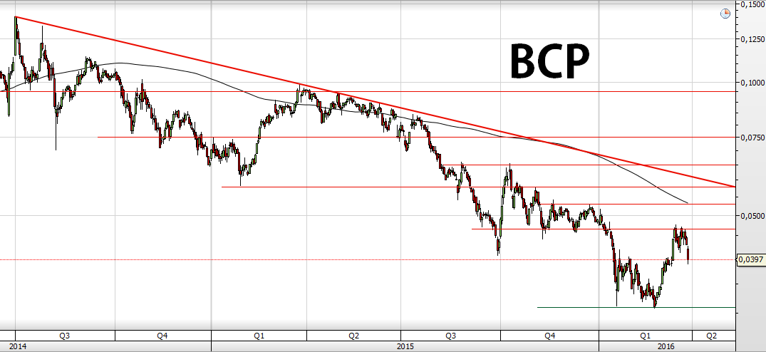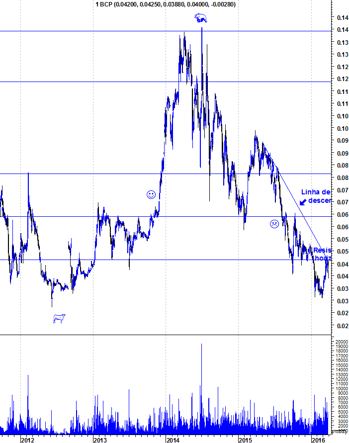 Tecnicamente, o BCP continua na mesma situação que referi há uns dias atrás: Enquanto não quebrar a resistência horizontal e a LT descendente, a bola está do lado dos ursos.