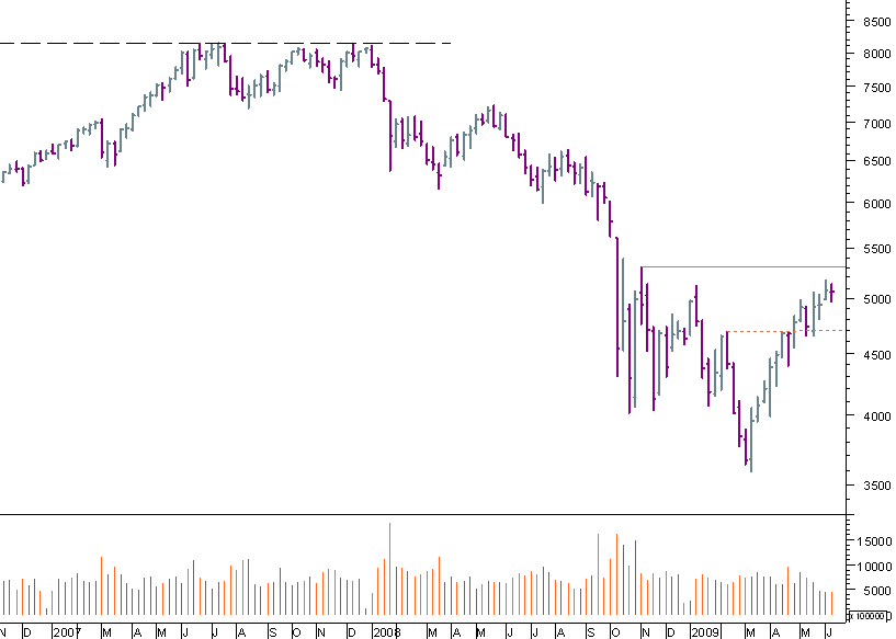 aliás pode até dizer-se que este foi o mês da lateralização: o índice, se por um lado não pôs em causa o suporte referido a semana passada, também não foi capaz de ultrapassar o máximo realizado na 1ª semana do mês