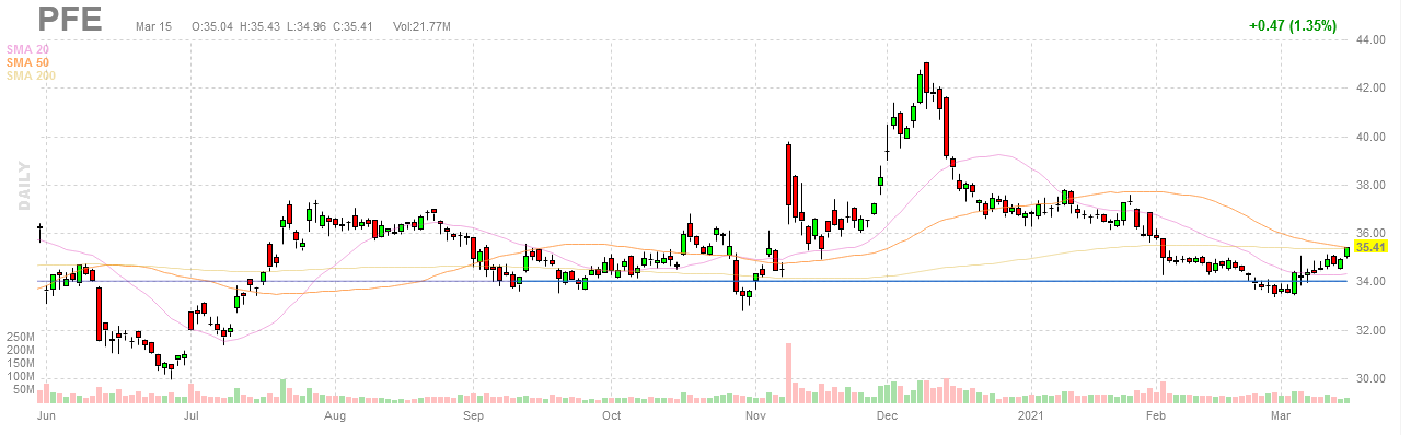 Já por duas ou três vezes que partilho o gráfico da PFE. Suporte mais que evidente na zona dos $ 34. Com os cancelamentos que vários países estão a decidir por administrar a vacina da Astrazeneca, poderá este contratempo ser um catalizador para uma subida da Phizer ?