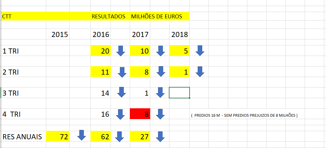 Aqui nos CTT os fundamentais EVIDENCIADOS nos relatórios e contas são de QUEDA dos RESULTADOS há 10 TRIMESTRES e sem NENHUM sinal de inversão , o resto é conversa otimista .