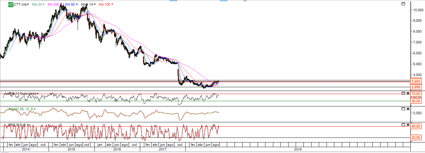 A pequena recuperação dos 2.88 para 3.40 dum titulo que vem consecutivamente a cair dos 10 euros para 3 euros , não é nada de significativo e evolui fundamentalmente com fecho de curtos o que é um mau sinal para o medio prazo.
