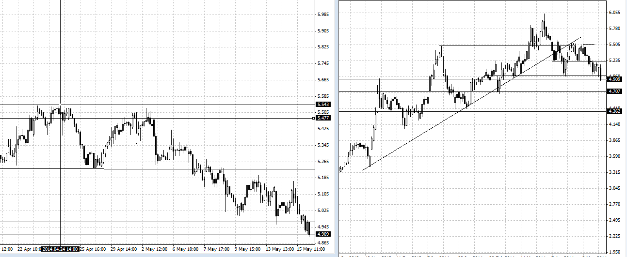 não tenho mt tempo,mas caso quebre os 4,97 em fecho é possível que va ate á zona dos 4,70 ai poderá haver alguma reação,caso quebre os tais 4,70 temos a zona dos 4,35 e depois os 3,6